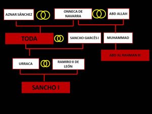 A principios del siglo X aparece en la historia Toda Aznar, hija del conde Aznar de Larraún y de Onneca, conocida como Toda de Pamplona. Una mujer extraordinaria que se convertiría en el eje de la política peninsular. Era nieta de Fortún Garcés, el heredero de la comarca pamplonesa. Toda se casó con Sancho Garcés y su hermana Sancha, con Jimeno Garcés. Sancho Garcés era un noble del Pirineo suroccidental del linaje Jimena, un hombre respetado y admirado por su arrojo y valentía. Estos matrimonios unieron las dos grandes familias pamplonesas: los Íñiguez y los Jimeno.