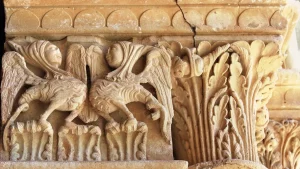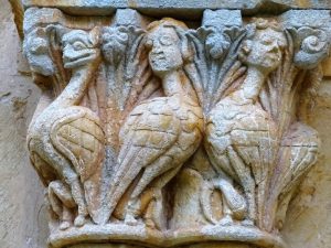 Las arpías son criaturas mitológicas que aparecen con frecuencia en la rica iconografía del bestiario románico. Se las representa, por lo general, con cabeza de mujer, cuerpo de ave rapaz y provistas de alas y garras. En ocasiones, presentan cola de serpiente o de escorpión, lo que les confiere un aspecto aterrador o grotesco.