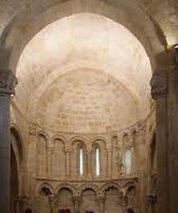 El alto ábside está cubierto con una bóveda de un cuarto de esfera. Lo forman dos cuerpos de arquerías de medio punto: