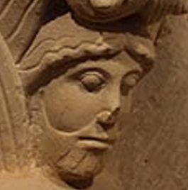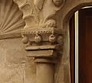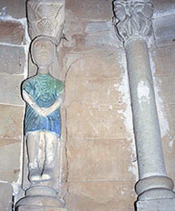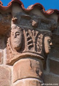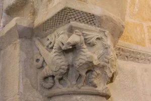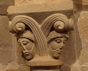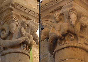 Son significativos los capiteles del arco del triunfo. En uno, un personaje lucha cuchillo en mano contra un cuadrúpedo asistiendo de testigo una serpiente con cabeza humana; y en otro hay una lucha entre dos dragones.