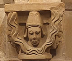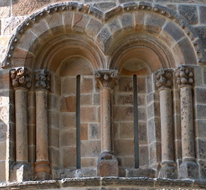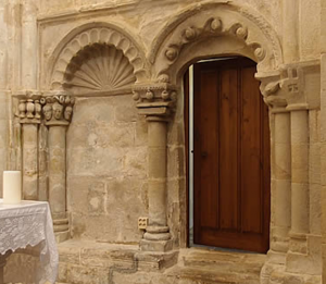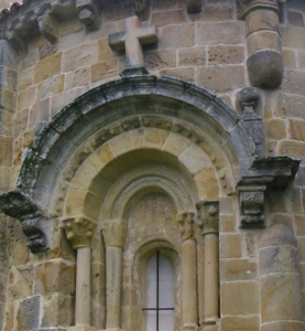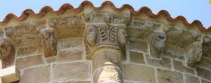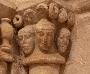 Las cinco arquerías ciegas del grupo inferior están sustentadas por capiteles con representaciones de cabezas humanas. Como son doce, algunos autores han pensado que se puede tratar de los apóstoles. En el centro figura un obispo con mitra.