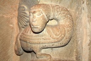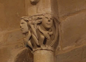 En la capilla de la epístola sobresale un capitel con animales fantásticos luchando entre sí. Según he leído, se refiere al pecado de la ira (¿?). En el muro contiguo, ocupando una hornacina con un arco de medio punto, un hombre con barba tiene un cuchillo entre sus manos y a su lado hay un muchacho. Se dice que representa el sacrificio de Isaac.
