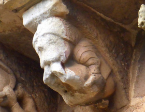 Un pequeño tejado, sostenido por una serie de canecillos, protege la puerta. Estos canecillos, como los del resto de la iglesia, son célebres por su decoración variada y atrevida, que incluye figuras eróticas, animales y escenas de la vida cotidiana. El dintel y el tímpano presentan hojas de pétalos entrelazadas, mientras que el friso superior muestra tres parejas de leones afrontados. En los laterales aparecen relieves algo toscos de temática bíblica: Daniel en el foso de los leones, Adán y Eva, y el arcángel San Miguel.