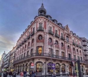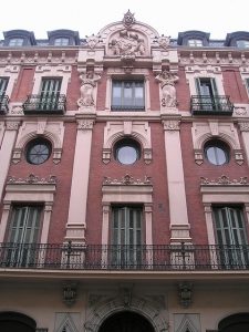 El piso principal tiene unos amplios y esbeltos ventanales y un balcón corrido de hierro forjado que rodea todo el edificio. La segunda planta está ornamentada con huecos en forma de óculo. En la tercera planta, cada ventanal cuenta con un balcón individual de hierro forjado. La construcción se corona con elegantes mansardas cubiertas con arcos aplanados y en la esquina superior sobresale un torreón mirador. Los balcones y huecos de la fachada están separados por elegantes pilastras almohadilladas.