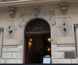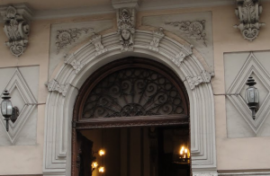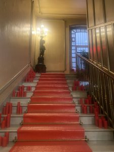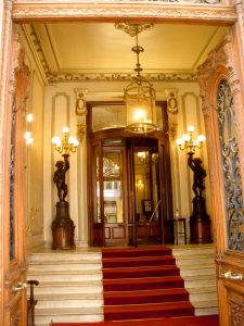 El vestíbulo cuenta con una hermosa escalera de mármol, que tiene a su lado una lujosa alfombra roja cardenal, y un ascensor espléndido hecho de madera noble, cristal y hierro forjado. La escalera va desde el semisótano hasta los pisos superiores. Los descansos tienen estatuas de niños sosteniendo antorchas de luz.