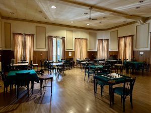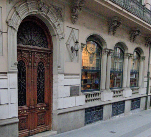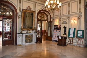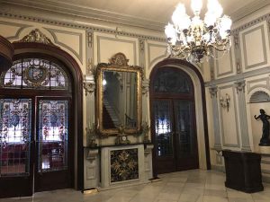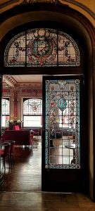A la izquierda del vestíbulo y divididos por dos puertas de bellas vidrieras, se encuentra un vasto lugar que los miembros emplean para charlas.