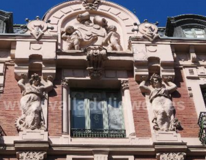 Sobre la puerta principal del tercer piso, que cubre al menos dos alturas y llega hasta las mansardas, se encuentra una ventana grande con dos estatuas de tamaño considerable que simbolizan a Minerva, diosa del comercio, y a Ceres, diosa de la agricultura. Sobre el ventanal hay un frontón con un arco semicircular que culmina en un relieve. En el tímpano, dos pequeños genios que sostienen el escudo de la sociedad se destacan.