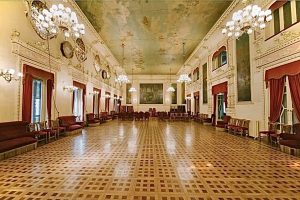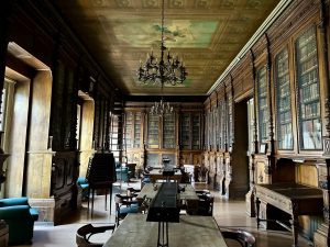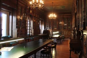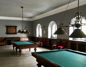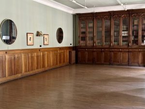 Esta sala también era empleada para realizar banquetes de gran tamaño. La tercera puerta conduce a una biblioteca que alberga estanterías de nogal con libros y documentos históricos del casino. Está adornada con representaciones simbólicas de las artes, las ciencias, la escritura y la lectura.