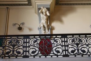 Las paredes están bien decoradas y el artesonado es parte del portal; además, incluye una lámpara de techo y candelabros a los lados. Dos estatuas de infantes sosteniendo antorchas de luz concluyen una escalinata elegante.