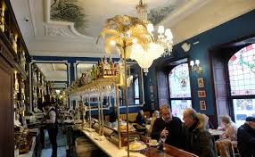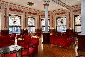 Hacia la derecha, se encuentra una puerta que lleva a un bar cafetería decorado de manera lujosa, con barra, mesas y sillas. Un sitio de reunión para beber café o alguna otra bebida.