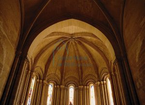La iglesia es de una sola nave con planta de cruz latina y cinco tramos. El crucero está ligeramente elevado, y el arco triunfal, de gran relevancia, simboliza la transición entre lo terrenal y lo divino. En la cabecera, hay cinco elegantes ventanales alargados, estrechos y abocinados que inundan de luz el interior. La bóveda románica es de un cuarto de esfera y está reforzada por ocho nervios que convergen en la parte más alta en una «clave» central y descienden a los muros apoyándose en semicolumnas adosadas.
