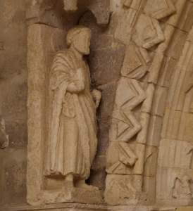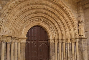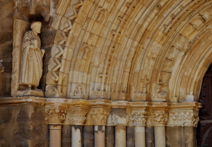 La puerta de Poniente muestra un estilo tardo románico, más cercano al gótico. Se caracteriza por su estructura abocinada y su detallada decoración. Cuenta con siete arquivoltas apuntadas, adornadas con motivos como hojas cuadrifolias, ángeles verticales y dientes de sierra. Cada arquivolta reposa sobre columnas de fustes cilíndricos y capiteles con decoración vegetal. Flanqueando la portada se encuentran dos esculturas de San Pedro y San Pablo, que se cree fueron añadidas posteriormente.
