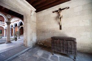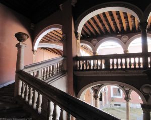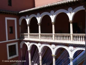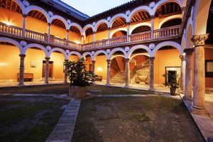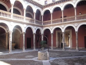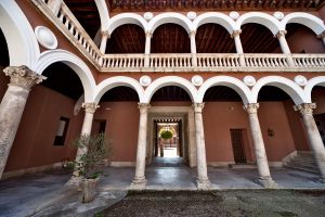 El patio del edificio es un claro ejemplo del clasicismo renacentista. Está rodeado por arcadas de medio punto soportadas por columnas toscanas que crean un fantástico espacio de sombras. Las paredes están decoradas con balaustradas, yeserías y con pinturas de motivos vegetales, geométricos y con medallones típicos del Renacimiento. En el centro, una fuente aporta un toque de frescura y serenidad al ambiente. Una imponente escalera de doble rampa, diseñada por Pedro de Mazuecos, conecta los diferentes niveles del palacio.