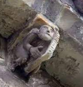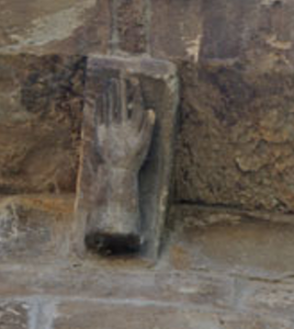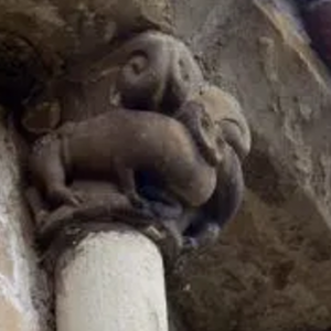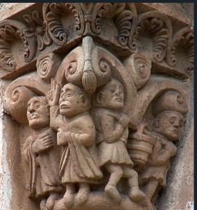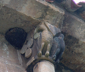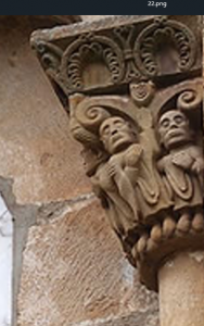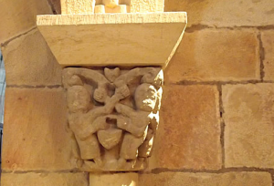 En la ventana central, el capitel izquierdo y el cimacio figuran cabezas humanas idénticas puestas en fila, sobre unas hojas rematadas con piñas: un símbolo del Paraíso y la eternidad. El capitel del otro lado tiene unas manzanas: Símbolo del pecado original como la tentación terrenal.