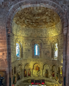 El interior del ábside se divide en dos cuerpos separados por una imposta ajedrezada. El inferior alberga una arquería ciega, mientras que el superior ilumina el templo con sus ventanas.