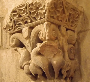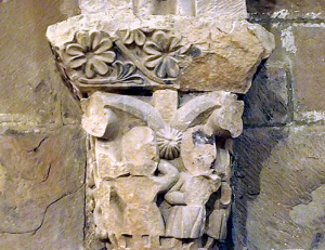 Los capiteles del arco triunfal están muy altos, lo que dificulta su observación, incluso con prismáticos. En el lado izquierdo hay un cimacio con animales entrelazados en círculos; dentro de la cesta, una cabeza humana devora a un monstruo que, a su vez, está tragando un cuerpo desnudo que apoya sus pies en el lomo de dos animales opuestos. La escena es compleja e irreconocible. En los laterales de la cesta, hay aves que parecen beber o picotear, aunque todo está muy deteriorado. El capitel del lado derecho es difícil de evaluar debido a su destrozo. Aparentemente, hay un hombre entre volutas con un báculo, otro con una cruz y, en la otra cara, un hombre sedente con las piernas destrozadas.