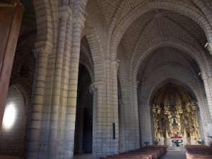 El interior de la iglesia es de planta rectangular basilical con tres naves, siendo la central más ancha y alta. En la cabecera, presenta tres ábsides semicirculares, siendo el central el más prominente. Las bóvedas son de crucería con arcos fajones y las columnas sostienen capiteles tallados.