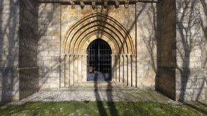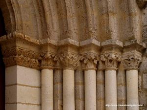 En la iglesia de Nuestra Señora de las Fuentes, lo primero que llama la atención es la puerta abocinada de medio punto, orientada al sur, flanqueada por jambas y columnas con capiteles ornamentados con detallados motivos vegetales y, en ocasiones, máscaras o figuras. A ambos lados de esta puerta, hay dos ventanas con arcadas de medio punto que armonizan con la portada.