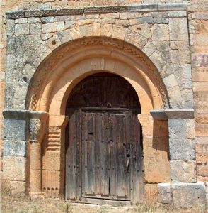 La puerta de entrada, situada en el muro sur, es sencilla: un arco de medio punto con dos arquivoltas, una de ellas ajedrezada. Las jambas, también reaprovechadas con material romano, muestran una cesta en el lado izquierdo.