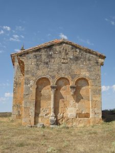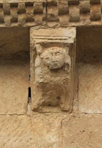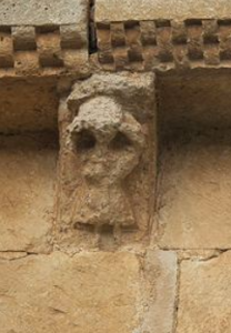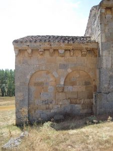 El ábside cuadrado es una de las características más singulares del románico burgalés. Sus canecillos, aunque deteriorados por el tiempo, sostienen el alero del tejado con figuras humanas, mitológicas y animales. Pero lo más notable son sus arquerías ciegas, tanto por su forma como por las lápidas reutilizadas.