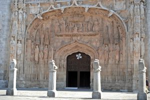 La puerta de entrada al templo tiene un arco conopial abocinado, protegido por un amplio arco carpanel que forma una especie de tejadillo en el que se enmarca un fantástico repertorio ornamental. Sobre el arco de acceso, está la Coronación de la Virgen en presencia orante de Fray Alonso de Burgos. Al ser él su benefactor, no es de extrañar que el autor se localizara en un lugar tan prominente. El obispo, arrodillado y vestido con capa pluvial, mitra y báculo, quiso perpetuar su imagen como testigo excepcional de la ceremonia. La representación de la Coronación de la Virgen María es común en la orden dominica.