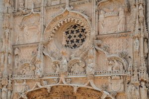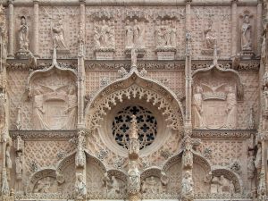El convento fue reconstruido entre 1445 y 1488. La majestuosa fachada, una joya del gótico isabelino, fue diseñada y ejecutada en 1497 por el escultor burgalés Simón de Colonia. La fachada original llegaba hasta la imposta del rosetón central, donde se asienta un frontón superior. En su frontispicio, se exhibe la heráldica de los Reyes Católicos, sostenida por dos leones rampantes y coronados y, detrás, está el águila de San Juan. El Evangelio de San Juan, considerado el más elevado teológicamente, se asocia con el vuelo del águila. Isabel la Católica, como princesa de Asturias desde 1468 tras la muerte de su hermano Alfonso de Castilla y por el llamado Pacto de los Toros de Guisando, incorporó el águila a su escudo. Al casarse con Fernando II de Aragón, el águila se integró en el escudo conjunto, simbolizando la unión y la fe de la nueva monarquía.