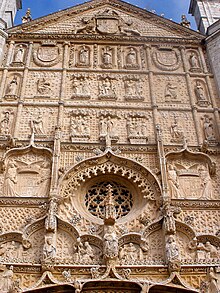 En la imposta, destacan dos gárgolas y, a los lados, dos pilares con forma de pináculos escalonados, decorados con numerosas esculturas bajo doseletes. Una discreta torre campanario los acompaña.