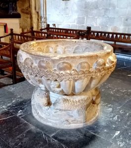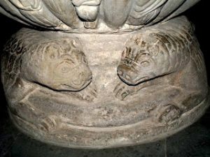 En la base se esculpieron dos leones echados, con las cabezas próximas, que simbolizan la victoria de Cristo sobre el pecado original a través del bautismo.