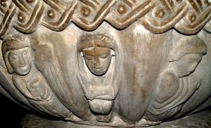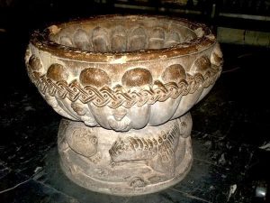 La tenue iluminación del templo, con sus claroscuros, y el reflejo indirecto de la luz que penetra por las ventanas, generan sobre la superficie de la pila un juego de sombras y destellos en las figuras esculpidas.