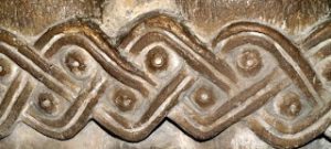 Tallada en piedra, presenta una decoración basada en segmentos curvados convexos y sobresalientes que se puede apreciar por fuera y cóncavos en el interior. Recuerdan a los pétalos de una flor o los gajos de una naranja, unidos por un elegante cordón entrelazado, recurso frecuente en el arte románico y gótico. El borde de la copa se decora con la mitad de un cordón.