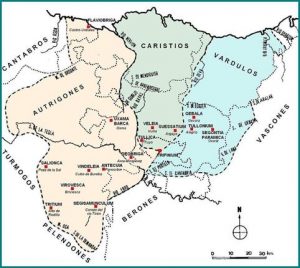 La arqueología revela que, en el periodo previo a la conquista romana, las tribus vascas experimentaron una expansión desde el suroeste de los Pirineos occidentales hacia el territorio que hoy conocemos como Vascongadas. Esta invasión forzó a los várdulos a desplazarse hacia el suroeste. Efectivamente, la ocupación de su territorio ancestral por tribus vascas condujo a la eliminación o absorción de caristios y autrigones, quienes inicialmente se mantuvieron en sus dominios. Así, caristios (establecidos en Vizcaya y Álava) y autrigones (en Cantabria y Vizcaya) perdieron sus identidades originales, subsumiéndose bajo la denominación común de várdulos.