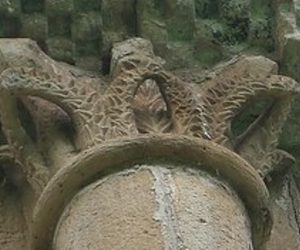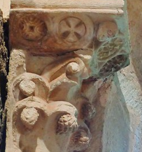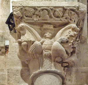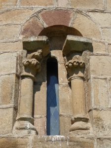 El ábside está dividido en tres calles por columnas adosadas que descansan sobre fuertes basas. El capitel de la semicolumna derecha muestra una cesta de acantos; en el de la izquierda, una cabeza sostiene una rama en la boca y sujeta a dos leones.