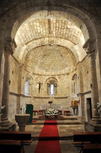 Al atravesar el arco triunfal se accede al ábside, cubierto por una bóveda de horno. Del presbiterio parten dos impostas: una pasa por encima de las ventanas y otra por debajo. La superior, apoyada en canecillos interiores trabajados con esmero, resulta sorprendente y muy original.