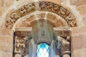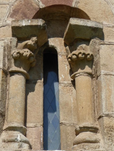Las ventanas del interior tienen arcos de medio punto decorados con arquivoltas ajedrezadas. Los fustes son lisos y los capiteles, historiados, se muestran ricamente elaborados.