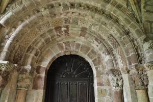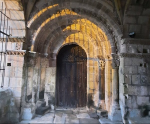 El arco triunfal, de medio punto, se apoya en columnas con capiteles historiados de notable factura. En el capitel izquierdo se representa la cabeza de un hombre en la parte superior de la cesta, que sujeta con sus manos las colas de dos leones como si fueran las riendas. En el capitel derecho hay una figura central de pie, vestida con túnica de pliegues, que agarra a dos grifos.