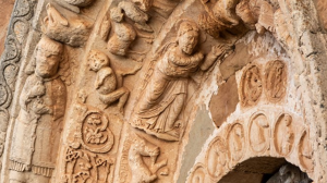 En la cornisa, una notable colección de canecillos sobrevivió al derrumbe, mostrando un universo de figuras humanas, animales e imágenes alegóricas.