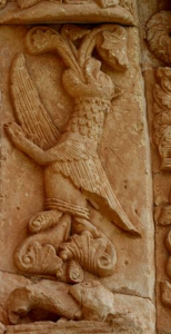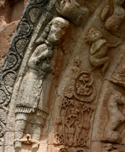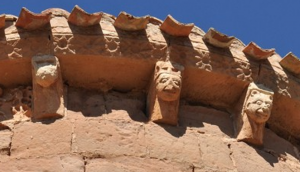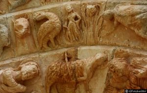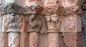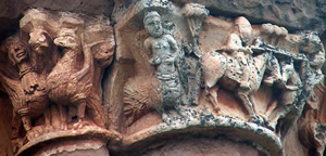 Los capiteles superiores de las semicolumnas, aunque difíciles de apreciar, llaman la atención por las imágenes del bestiario que se mezclan con episodios históricos de combates entre guerreros y caballeros.