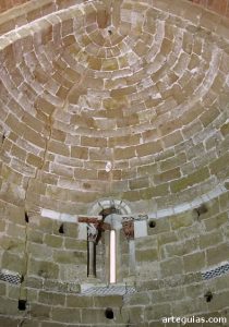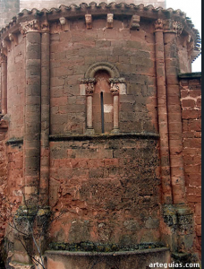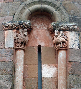 En el centro del ábside, una ventana aspillerada luce una doble arquivolta de medio punto, que reposa sobre capiteles con dos dragones y dos arpías, todos ellos exquisitamente tallados y apoyados sobre columnillas.