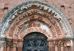 Las arquivoltas, talladas en dovelas, exhiben en relieve ángeles, apóstoles, santos y clérigos; caballeros con espada, figuras geométricas o animales como monos, corderos y caballos, y símbolos del bestiario. Todas estas piezas son de excelente factura y muchas de ellas están finamente talladas. Algunos textos sugieren que el arco fue recompuesto y, como resultado, quedó un arco rebajado en forma de medialuna.