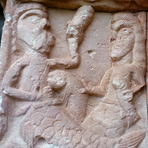 Las jambas que sustentan las arquivoltas también están decoradas. La del lado izquierdo, de la que solo se conserva la cara exterior, muestra un hombre alado con rasgos humanos y animales. En la derecha, sus caras internas son una pareja de aves con cuellos entrelazados, y la exterior, dos sirenas: una con un olifante y la otra ofreciendo un pequeño banco de peces.