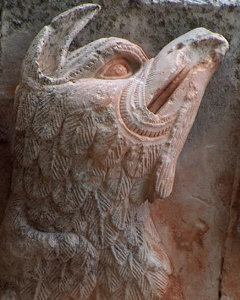 De cuatro capiteles del lado izquierdo, el exterior muestra un conjunto de piñas. El segundo presenta un grifo; el tercero, una figura del bestiario que parece un basilisco de mirada penetrante; y el interior, otro grifo más complejo. En los del lado derecho, el exterior está casi borrado. El segundo luce hojas gruesas dispuestas en dos planos y una pequeña cabeza humana de la que parten dos largas volutas. Los internos exhiben seres fantásticos como arpías y grifos, o aves, a menudo entrelazados con motivos vegetales.