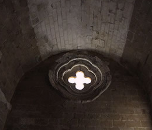 En el muro oeste, sobresale un óculo tetralobulado que evoca la cruz griega adoptada por la orden de los caballeros hospitalarios.