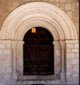 La puerta de entrada a la iglesia es soberbia, aunque en aquel momento estaba muy deteriorada. Consta de un arco de medio punto decorado con siete arquivoltas, apoyadas en capiteles sobre columnas. En el capitel izquierdo se observa una pareja de leones con largas patas y robustas melenas, y en el derecho, una bestia atacando a un hombre. En el tejado de la galería, una ménsula presenta figuras decorativas como un cilindro y una piña.