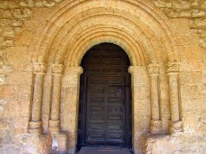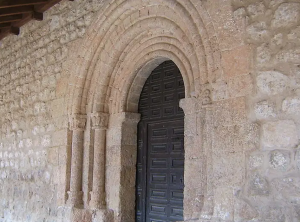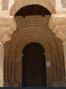 La portada de acceso al templo, abocinada, está dentro de la galería y adornada con cinco arquivoltas que descansan sobre capiteles esculpidos con piñas, motivos vegetales, figuras humanas y leones. Estos capiteles, a su vez, se sostienen sobre columnas simples o dobles. Las jambas soportan un arco de medio punto decorado con baquetones, al igual que las arquivoltas.