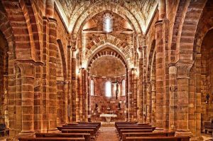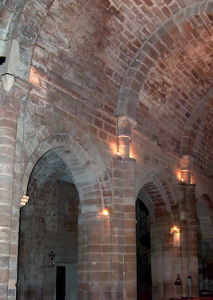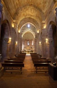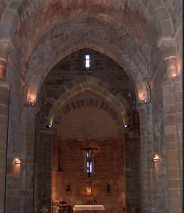 El interior se caracteriza por su austeridad decorativa, destacando la piedra arenisca de tonos grises y rojizos. La solidez de los muros y la escasa iluminación responden al estilo románico, que buscaba transmitir recogimiento y espiritualidad.