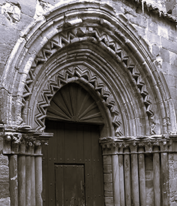 En la fachada occidental se sitúa la entrada al templo, que es la parte más ornamentada. Está poco abocinada, mantiene los tonos rojizos y grisáceos de la piedra y consta de varias arquivoltas apuntadas. La primera y la tercera presentan decoración de dientes de sierra, mientras que la segunda y la cuarta están formadas por baquetones. Los arcos se apoyan en capiteles vegetales, propios del Císter, sostenidos por ocho columnas esbeltas y elegantes, con cierto efecto de zigzagueo.