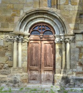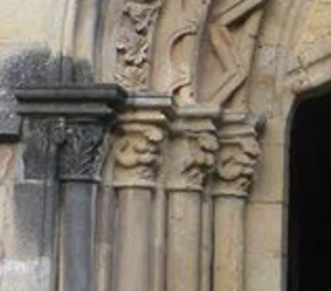 Recorriendo el templo por fuera, se ven dos puertas de entrada: La puerta del oeste es muy armónica, aunque está muy retocada. Tiene arquivoltas con arco apuntado. El arco interior muestra una decoración en zigzag, el intermedio tiene arquillos y el exterior se ornamenta con hojas que parecen de roble. (6). Se ha escrito que esta decoración es una simbología de los rayos del cielo y una puerta de entrada al paraíso. Los arcos del conjunto se apoyan en capiteles individuales donde vemos aves enfrentadas juntando sus picos, cestas vegetales y hojas de acanto como el símbolo de la eternidad. En el tímpano figura la Virgen con el Niño de enfoque naturalista; una representación gótica de la advocación a la Virgen del Puerto como protectora de marinos y pescadores.
