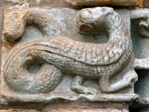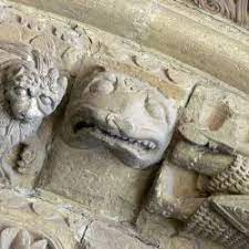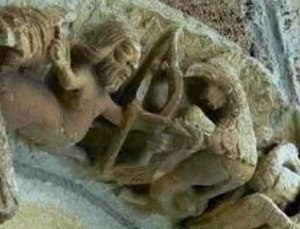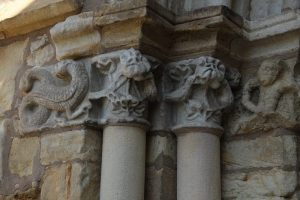 En el arco triunfal, el capitel del lado izquierdo tiene unas arpías de cabeza humana y cuerpo de ave, y en el derecho figuran guerreros a pie y a caballo.