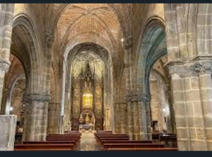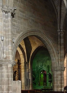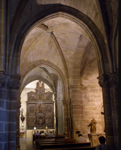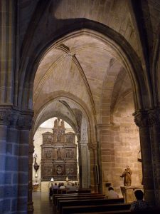 En el interior del templo se comprueba que la fábrica, aunque tiene elementos tardo-románicos, su trazo es gótico. En el siglo XVI, aproximadamente hacia 1530, se llevaron a cabo importantes reformas con la reconstrucción del ábside y el crucero, a los que dotaron de amplias bóvedas de crucería de origen centroeuropeo. En las claves hay representaciones de apóstoles y temas del descubrimiento de América.