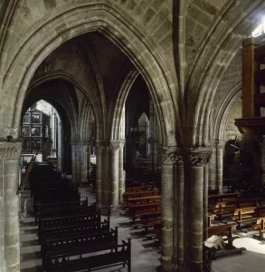 Dentro de la iglesia hay tan poca luz que la estancia impresiona. Se puede comprobar su planta basilical con tres naves: la central, más ancha y alta, está separada de las laterales por arcos de medio punto que se apoyan en robustas columnas cilíndricas, dando el conjunto sensación de solidez y serenidad. Estos imponentes arcos refuerzan su estructura y crean amplios espacios para la acústica.